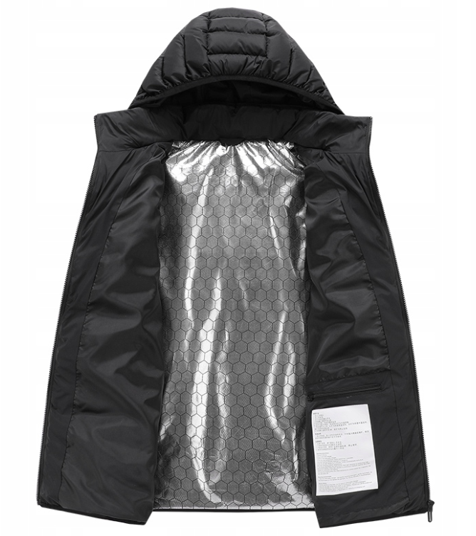 Wnętrze kurtki podgrzewanej z warstwą refleksyjną odbijającą ciepło. Sześciokątna struktura zapewnia równomierne rozprowadzanie temperatury i dodatkową izolację termiczną, zwiększając komfort i skuteczność ogrzewania.