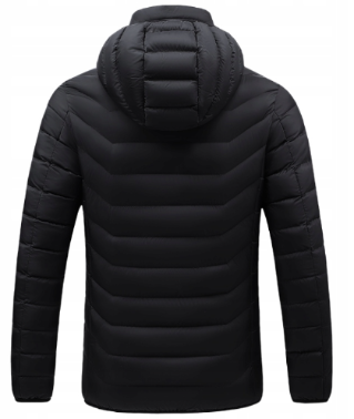 Tył podgrzewanej kurtki o nowoczesnym, pikowanym kroju. Ergonomiczne przeszycia zapewniają lepsze dopasowanie do sylwetki i równomierne rozprowadzanie ciepła, a kaptur chroni przed wiatrem i chłodem.