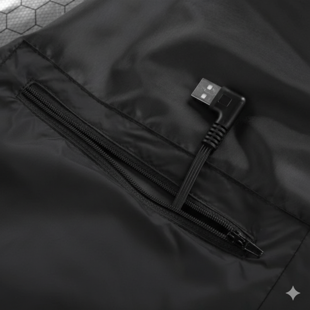 Kurtka wyposażona jest w ukryty port USB, który umożliwia szybkie i bezpieczne podłączenie powerbanku. Praktyczna kieszeń z zamkiem chroni przewód i akumulator przed uszkodzeniem oraz wilgocią.